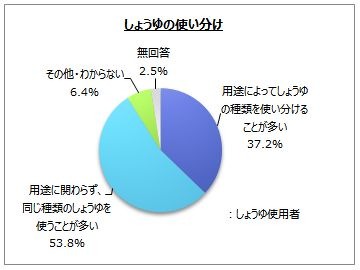 しょうゆ利用者にしょうゆの使い分けについて聞いたところ、「用途によってしょうゆの種類を使い分けることが多い」が37.2%、「用途に関わらず、同じ種類のしょうゆを使うことが多い」が53.8%です。西日本では「用途によってしょうゆの種類を使い分ける」、東日本では「用途に関わらず、同じ種類のしょうゆを使う」が半数を超えます。