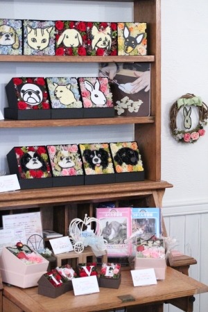 お店に入るとかわいいペットの似顔絵フラワーがたくさん展示されており、プリザーブドフラワーを使って制作されたアレンジメント作品を近くで見たり、手にしたりして楽しむことができます。(もちろん購入も可能です)