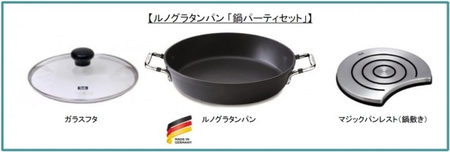 「鍋パーティセット」キャンペーンは、 「ルノグラタンパン」のほかに、「ガラスフタ」と「マジックパンレスト(鍋敷き)」がセットに。