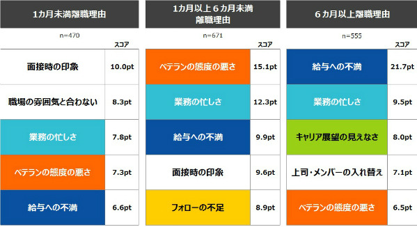 入社1カ月以上6カ月未満の退職者の主な離職理由は、「ベテランの態度の悪さ」や「業務の忙しさ」が上位に挙げられていますが、「フォロー不足」もランクインしています。「フォロー不足」は入社時の研修期間が終了した後、職場でのフォローがなくなってしまうことが離職を招いていると推測できます。また入社6カ月を過ぎると、「キャリア展望の見えなさ」も離職理由の上位に挙がります。「このままこの職場で働き続けていていいのだろうか」という将来に対する漠然とした不安を払拭するような制度・コミュニケーションを整備し、働き続けることへの安心感を提供することが中計・ベテラン層のケアには重要です。<図表1>