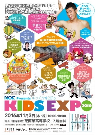 株式会社学研ホールディングス(東京・品川 代表取締役社長/宮原博昭)のグループ会社、株式会社学研プラス(東京・品川 社長/碇 秀行)は、文化放送と協力タッグを組んで『NOK Presents KIDS EXPO~キッズ万博2016~』を東京都立芝商業高校グラウンドにて11月3日(木・文化の日)に開催します。
