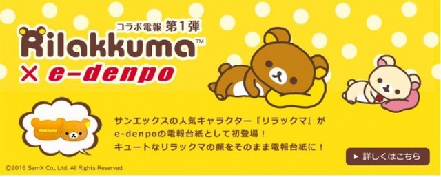 電報サービス「e-denpo」を手掛ける株式会社KSGインターナショナル(本社:大阪府大阪市北区/代表取締役社長:高橋 泉)は、「リラックマ電報(電報台紙)」特設サイトを公開しました。「e-denpo」は1通1000円(税別)という低価格で写真・ロゴ・サイン入りのオリジナル電報(祝電・弔電)を即日配達することができる新しいインターネットサービスです。
