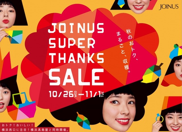 相鉄グループの(株)相鉄ビルマネジメント(本社・横浜市西区、社長・千原広司)は、平成28年(2016年)10月26日(水)から11月1日(火)までの期間、ジョイナス全館にて「ジョイナス スーパーサンクスセール」を開催いたします。メンズ、レディスのトレンドファッションから今すぐ着られる秋アイテム、アクセサリーやライフスタイル雑貨がお値打ち価格でお買い求めいただけます。