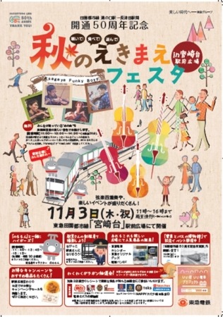 イベント当日は駅前広場に特設ステージを設置し、ご家族で楽しめる弦楽四重奏コンサートや東急線キャラクター「のるるん」との撮影会を行うほか、東急オリジナルグッズや美味しい食べ物を販売するテントも出店します。また、周辺のお店や電車とバスの博物館でも、お得なキャンペーンや記念写真展を開催するなど、駅前広場の全体が50周年の感謝の気持ちをこめたイベント会場となります。