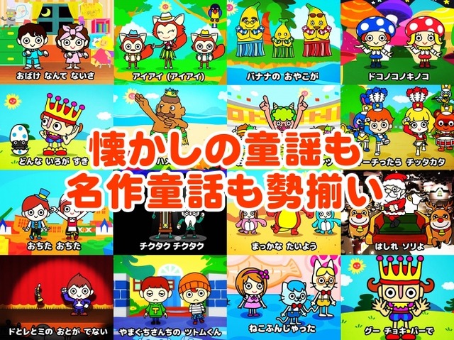 赤ちゃんから子供まで、アニメーションで童謡の視聴や、絵本の読み聞かせができる子供向け知育アプリ(子供向け知育教材)です。「リズム感」や「語彙力や道徳観」を養う童謡童話のアニメーションを50作品以上提供しております。