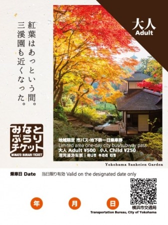 横浜市では、三溪園のPR・誘客及び市営交通の利用促進を目的に、紅葉の三溪園のデザインを施した、横浜ベイエリア1日乗車券「みなとぶらりチケット」を2,000枚限定で発売します。平成28年10月1日から「みなとぶらりチケット」の適用エリアが三溪園まで拡大され、また、横浜駅東口と三溪園正門を結ぶ「ぶらり三溪園BUS」運行開始により、市内人気エリアと三溪園の往来がしやすくなりました。このお得で便利なチケットで、秋の横浜めぐりをお楽しみください。