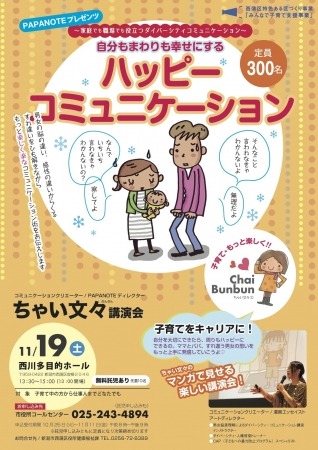 講師は、新潟市在住の漫画エッセイスト・コミュニケーションクリエイターで、新潟市初の父子手帳「PAPANOTE(パパノート)」のディレクターでもある、ちゃい文々さんです。