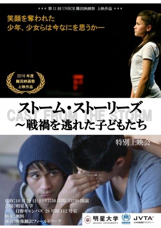 日本映像翻訳アカデミー(Japan Visualmedia Translation Academy:以下JVTA)の講師陣が指導を行う明星大学人文学部国際コミュニケーション学科の「映像翻訳フィールドワーク」では、10月29日(土)に学生たちが字幕翻訳を手がけたドキュメンタリー長編映画『ストーム・ストーリーズ~戦禍を逃れた子どもたち』(2016年度「UNHCR難民映画祭」上映作品)を特別上映いたします。
