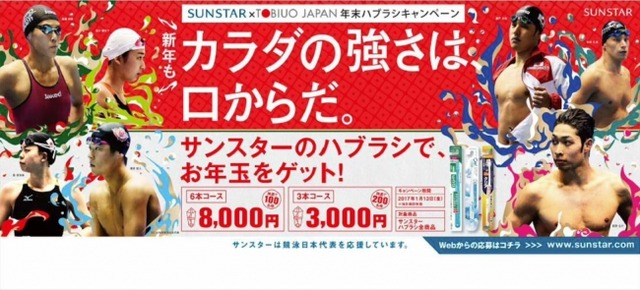 毎回ご好評をいただき、今年で9回目となる年末・年始ハブラシキャンペーン。今回は「カラダの強さは口からだ。」をテーマに、「競泳日本代表」の選手達とともに新しいハブラシで気持ちよく新年を迎えることを提唱して参ります。本キャンペーンでは、サンスターハブラシをご購入いただいた方を対象に、抽選で300名様にお年玉をプレゼントいたします。