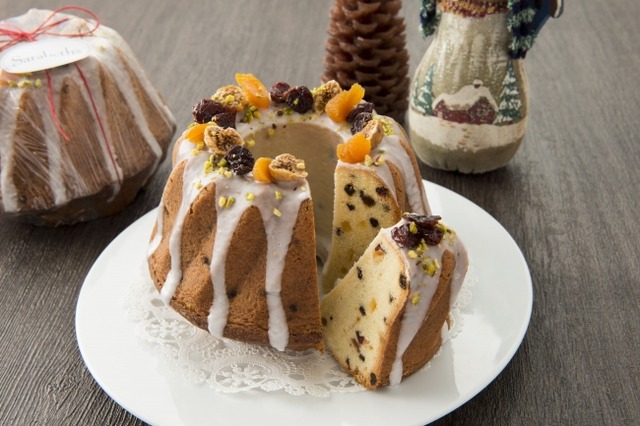 『Sarabeth'sオリジナルクリスマスケーキ』は、イチジクやアプリコットなど、ドライフルーツをたっぷりと詰めたパウンド生地をクグロフ型で焼き上げた、ホームメイド感溢れる、素朴で優しいクリスマスケーキ。クリスマスを彩る洋酒の香りをアクセントに、しっとりした食感をお楽しみいただけます。