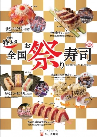 11月の「特ネタ」は10月に大変ご好評をいただいた「全国お祭り寿司」第2弾。「旬ネタ」は「北海道の幸」を選定し、期間限定フェアを開催いたします。