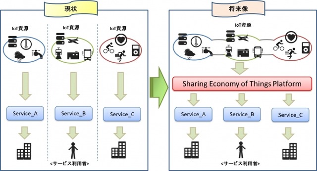 今回のサイバーメディアセンターとの共同研究の成果を活用し、様々なプレーヤが提供するIoT資源を共有できる「シェアリングエコノミー共通基盤」を実現することで、“他のプレーヤが登録した余剰リソースの有効活用”や“ IoT資源の活用によるサービス提供までの時間短縮と初期コストの低減”、“IoT資源を副次利用することでのサービス範囲の拡大”など、IoT時代に適合したメリットあるサービス提供の活性化を目指します。