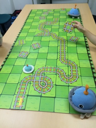 「ワオっち!」ブースでは、アプリの『レールつなぎ』で、レールのつなぎ方や、ピースの並べ方などを練習した後、実際に、参加者みんなで、順番に手持ちのピースを並べて大きなレールを完成させます。