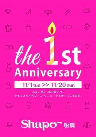 シャポー船橋は、2016年11月13日にライフスタイルゾーンリニューアル1周年を迎えます。これを記念して、2016年11月1日~20日まで1周年記念キャンペーンを開催いたします。シャポー船橋でしか手に入らない限定商品の販売やノベルティのプレゼント、さまざまなワークショップの開催のほか、シャポー船橋でのお買いものをするとご応募いただけるプレゼントキャンペーンを実施いたします。