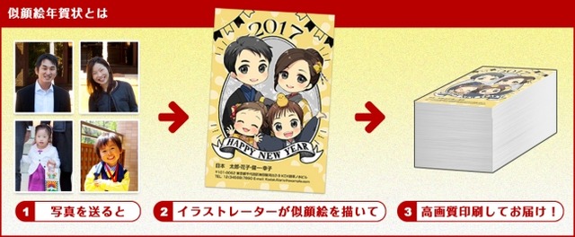 従来の写真年賀状に加え、似顔絵年賀状を提供することで「送って楽しい、もらってうれしい年賀状」の提供を目指します。