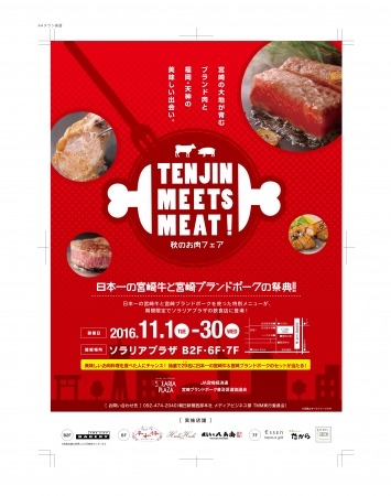 西日本鉄道株式会社が運営する商業施設ソラリアプラザでは、平成28年11月1日(火)から11月30日(水)までの1ヶ月間、JA宮崎経済連・宮崎ブランドポーク普及促進協議会とのタイアップ企画「TENJIN MEETS MEAT!秋のお肉フェア」を開催します。期間中、ソラリアプラザB2F、6F、7Fの参加飲食店で宮崎牛・宮崎ブランドポークのオリジナルメニューを提供いたします!