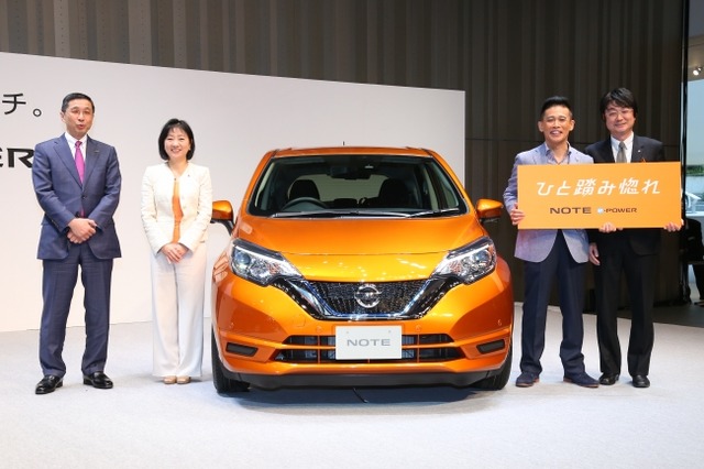 その後、日産自動車の専務執行役員 星野朝子は「日産自動車は10年かけてこの新しい新世代パワートレインを開発してきました。このパワートレインは発明であり、業界におけるエポックなのだと思っています。本日満を持して、皆様にお披露目できることを、大変嬉しく思います」と喜びのコメントをしました。そして「NOTE e-POWER」を「電気自動車の新しいカタチ」であると力強く話し、「アクセルペダルをひと踏みするだけで、お客様はその魅力にとりこになることでしょう」と語りました。また、「NOTEがe-POWERを搭載する最初の車種となったのは、少しでも多くのお客様にこの最先端の技術を見て、乗って、感じていただきたいから」とその想いを語りました。最後に「コンパクトカーの概念をこの新型パワートレインが覆すと確信しております。百聞は一見にしかずですので、ぜひこの走りを体験していただきたい」と呼びかけました。
