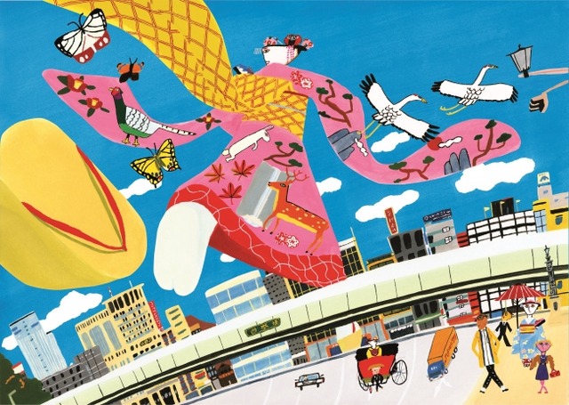 日本橋にやってきた舞妓さん。ぽっくり下駄が脱げてしまいながらも、一生懸命頑張る様子を表しています。