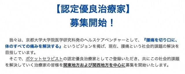 そこで、当社は、腰痛対策アプリ『ポケットセラピスト< https://pocket-therapist.jp >』のトライアル版を9月20日にリリースし、10月末までに全国から数百名の会員登録を頂いております。しかし、認定優良治療家は関西圏を中心にごく少数であり、多くのユーザーの皆様をフォローする体制が整っておりませんでした。そこで関東地方と関西地方で募集及び認定を開始し、ユーザーの皆様の腰痛改善をフォローできる地域を順次、全国へ展開していきます。