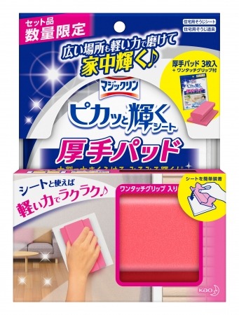 花王株式会社は、2016年11月12日に、住宅用そうじシート「マジックリン ピカッと輝くシート 厚手パッド」に、軽い力でお掃除できる”ワンタッチグリップ”が付いたセット品を、数量限定発売いたします。