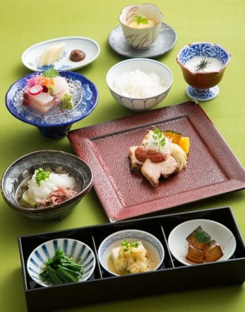 「日本料理なにわ」では、前菜からデザートまで、瀬戸もみじ(豚肉)や地野菜など庄原市ならではの食材や特産品をふんだんに盛り込んだ、“庄原づくし”のコース「庄原魅力満載コース」をご用意します。「比婆牛と茄子の素揚げ 高野大根を使った卸し煮」は、ほどよい脂のコクと豊かな風味、柔らかい舌触りが特徴的な比婆牛と茄子をカラリと揚げ、きめ細かでみずみずしい高野大根を使って煮物に仕上げた一品です。「庄原産瀬戸もみじ(豚肉)のソテーと庄原産白葱の針打ち 庄原産野菜の素揚げ(じゃがいも、南京、玉葱) トマトソース」は、ほどよい甘みと弾力がある瀬戸もみじと庄原産の野菜が、旨みのあるトマトソースと相性ぴったり。「庄原産こしひかりと庄原産長芋のとろろ掛け御飯 高野おにぎり味噌と高野大根の古漬け」は、中国山系からの豊かな水、昼夜の寒暖差が大きい気候の下で育った、そのままでも美味しいお米に、さらに庄原産の長芋のとろろ、おにぎりにもぴったりの高野味噌を使ったピリ辛風味の万能味噌、高野大根の古漬けと3種の変化で味わえます。夜は、同メニューに3種の庄原産日本酒利き酒セットを付けたお得なコースも楽しめます。