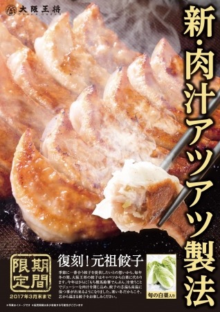 大阪王将では皆様にご愛顧いただいております『元祖餃子』を常に最高の品質でお客様に提案すべく、白菜が旬を迎え、気温の低下とともに糖度が増し最高の状態を迎えるこの時期に、創業当時の味を再現いたします。