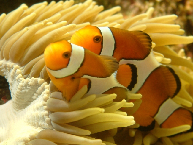 イソギンチャクと共生しているカクレクマノミ。メスが卵を産んだあとは、オスが産卵床のお掃除をしたり、ヒレを使って酸素の豊富な新鮮な海水を送ったりと、懸命に卵のお世話をします。外敵が来ると体当たりなどで追い払い、卵を守ります。