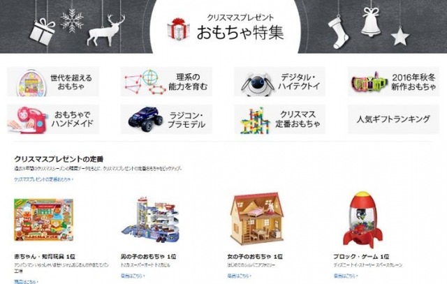 総合オンラインストアAmazon.co.jp(以下、Amazon)は、本日11月8日(火)、数百万点の品揃えの中からクリスマスにおすすめのおもちゃをご紹介する「クリスマスプレゼント おもちゃ特集(URL:http://www.amazon.co.jp/holidaytoylist)」を開始しました。