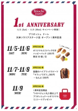 西日本鉄道株式会社が運営する商業施設ソラリアステージのB1Fにある「ブリオッシュドーレ」が、本日11月9日(水)にオープン1周年を迎えます。