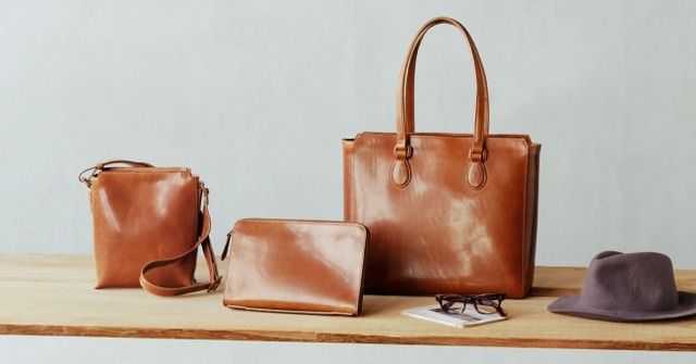 世代を超えて持てるデザインと、イタリアンレザーの美しい経年変化が魅力。左からB4クリアファイルが収まる大容量のトート(85,000円)、身軽な外出に持ちたいショルダー(60,000円)、クラッチ(45,000円)の全3型。*商品は全て税込み価格