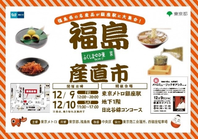 東京メトロ(本社:東京都台東区 社長:奥 義光)では、12月9日(金)・10日(土)の2日間に銀座駅構内において「第10回福島産直市」を開催し、福島県産品の販売と観光PRを行います。