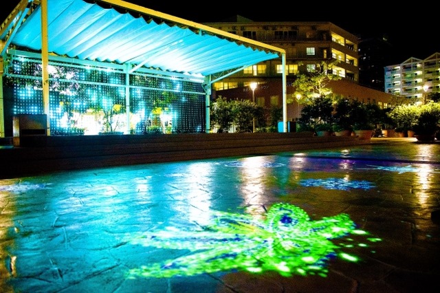 緑遊広場では、床面に氷の結晶の映像が投影され、その上を人が歩くと結晶から大輪の花が咲き誇ります。本コンテンツは、花火の美しさに、万華鏡をモチーフとした結晶の輝きを融合させたNAKED Inc.のアートコレクションである「FIREWORKS BY NAKED」とのコラボレーションコンテンツです。
