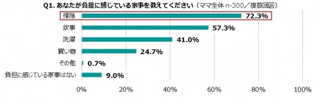 ママの72.3%が、「掃除」が負担と回答。共働きママにとっては「仕事と同じか、仕事以上に掃除がストレス」という声も。さらに、負担が大きい掃除をしても、家のキレイさには過半数が満足していない現状。