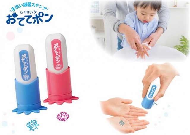 この度発売いたします「手洗い練習スタンプ おててポン」は、お子さまの手のひらにポンと“ばいきん”のイラストをスタンプし、印影がキレイに消えるまで石けんを使用してしっかり手洗いをすることで、上手な手洗いの練習ができる、新しい手洗い練習ツールです。“ばいきん”の印影を洗い落とす過程が視覚的に確認できるので、お子さまが楽しみながら手洗いの練習をすることができます。インキ色はブルーとピンクの2色で、安全性に配慮した食用色素を使用しています。