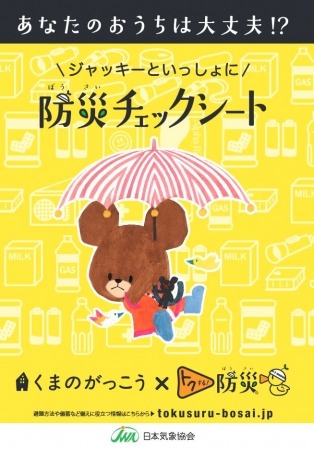 避難や備蓄に役立つ情報を掲載した「ジャッキーといっしょに 防災チェックシート」を、全国5カ所の「くまのがっこうショップ」や「トクする!防災」プロジェクトの後援自治体、各種イベントなどで無料配布します(数量限定、なくなり次第終了)。「防災チェックシート」は「トクする!防災」プロジェクトの公式ウェブサイト内、特設ページからもダウンロードできます。