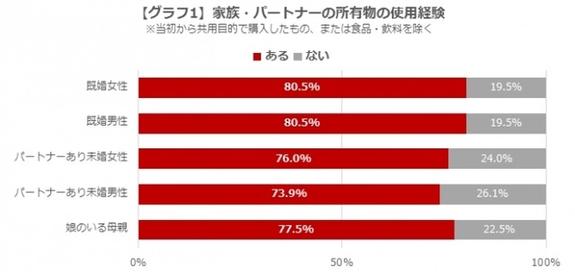 20代~40代の子どものいない既婚男女、特定のパートナーがいる未婚男女、および中学生から大学生までの娘と同居する母親の計1,000名に対し、家族・パートナーの所有物(当初から共用目的で購入したもの、また食品・飲料を除く)を過去に使用したことがあるかどうか尋ねたところ、すべての属性において「ある」と答えた人が7割以上となりました。属性で比較すると、既婚男女が最も高く、男女ともに80.5%が相手の所有物の使用経験がある結果となりました。性別や年齢を超えて愛用されるアイテムが身の回りに数多くあるようです【グラフ1】