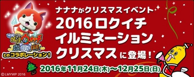 11月7日に六本木グランドタワーに本社移転を完了したテレビ東京のバナナ社員ナナナが、新最寄り駅、東京メトロ南北線六本木一丁目にある泉ガーデンのクリスマスイベント 「2016 ロクイチイルミネーションクリスマス」に参加。「映画 妖怪ウォッチ 空飛ぶクジラとダブル世界の大冒険だニャン!」の公開を記念したコラボも実施!オープニングテーマを歌う、キング・クリームソーダのライブイベントも開催します。
