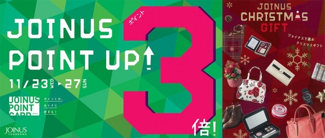 相鉄グループの(株)相鉄ビルマネジメント(本社・横浜市西区、社長・千原広司)は、平成28年(2016年)12月1日(木)に迎える、新生ジョイナス1周年を記念し、平成28年(2016年)12月26日(月)まで「ジョイナス 1周年 アニバースデー」を開催しております。第1弾の「アニバーサリーフェア」に続き、第2弾として平成28年(2016年)11月23日(水)から平成28年(2016年)11月27日(日)まで「ジョイナスポイントカード3倍ポイントアップ」を開催いたします。そして、クリスマスシーズンも到来。ジョイナスがオススメする、クリスマスギフト&パーティグッズ、クリスマスケーキなどを掲載した冊子も館内にて配布。さらに館内ディスプレイでもクリスマスのおススメ商品をご提案します。