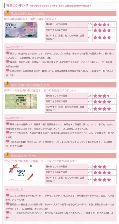 3位はQUOカードとなりました。「コンビニで使えるので使いやすい。デザインもかわいいものがある。使用後のカードが手元に残る」(37歳女性、お子さん3歳)「カードなのでかさばらないことと、おつりなどの心配をしなくて済むこと」(31歳女性、お子さん0歳、4歳)など、身近な場所で使うことができ、持ち運びも手軽なことが評価につながったようです。