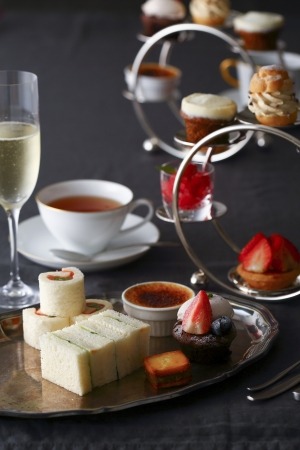 ■商品説明:14 時からの数量限定メニュー。サークル型のシルバートレイに盛り付けたプティサイズのスイーツ6 種のほか、セイボリー3 種をご用意しました。ドリンクはコーヒー、紅茶など15 種の中からお好きなものをお選びいただけます。厳選されたシャルドネのみを使用したクリーミーな泡立ちとエレガントな味わいが特徴のグラスシャンパン“ブラン・ド・シャルドネ”付きのセットもご用意しました。