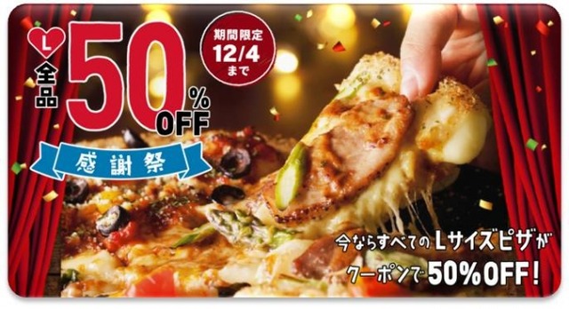 株式会社ドミノ・ピザ ジャパン(代表取締役社長:スコット・オルカー/本社:東京都千代田区、以下ドミノ・ピザ)が展開する、日本で最初のデリバリーピザチェーンドミノ・ピザは、今年1年間の皆さまへの感謝の気持ちを込めて、2016年11月26日(土)~12月4日(日)の期間限定で、ネット注文でLサイズ全品が半額となる「ドミノ・ピザ 感謝祭」を実施いたします。