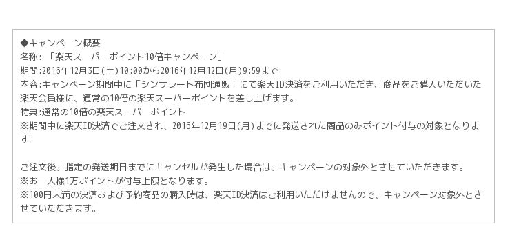 また、上記キャンペーンと併せて「シンサレート布団通販」にて期間内に楽天ID決済をご利用いただいた方にもれなく、通常の10倍の楽天スーパーポイントを差し上げます。