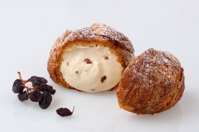 繊細なクロワッサン生地でシュー生地を包み込んで焼き上げた独自製法のシュー皮に、ラムレーズンを混ぜ込んだ濃厚なクリームを合わせました。