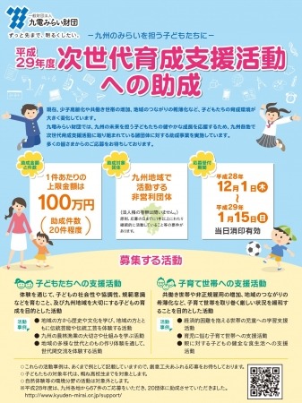 九州地域において、非営利団体が取り組む、子どもたちの健全育成や子育て世帯の支援を目的とした、以下のような活動(活動期間が、平成29年4月1日~平成30年3月31日のものに限る)