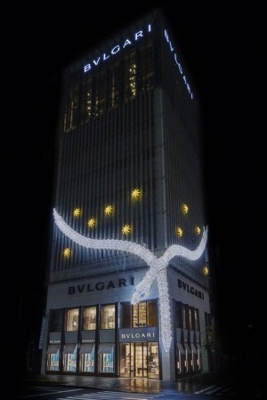 ブルガリのアイコンコレクション「セルペンティ(イタリア語で蛇の意)」は、古代ギリシャ・ローマ時代より「英知」や「永遠」のシンボルとして人々を魅了する蛇をモチーフに、1940年代に誕生しました。その魅惑的なアイコンを再現するイルミネーションは、新たにティール トパーズカラーの瞳が配され、アンバー イエローのエイト ポイント スターモチーフとともに、まるでジュエリーのような煌きに溢れます。