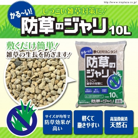 アイリスオーヤマ株式会社(本社:仙台市、代表取締役社長:大山 健太郎)のグループ企業である株式会社アイリスプラザ(宮城県仙台市青葉区中央2丁目1-7 アイリス青葉ビル TEL:0120-323-410)では、敷くだけで簡単にしつこい雑草対策ができる「防草のジャリ 10L」を2016年11月1日(火)に新発売しました。高温殺菌済の天然石を使用しており、軽くて撒きやすく、防草効果が高い小粒タイプです。