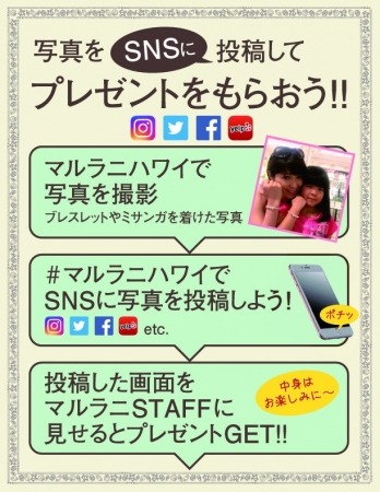 マルラニハワイ本店とアンテナショップワイキキ店では、ご来店のお客様に、その場でSNS投稿して頂くと、マルラニハワイオリジナルのエコバッグを差し上げます!キャンペーンを始めました!