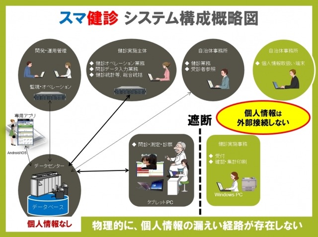 従来は個人情報保護の観点からインターネット・クラウドと健診システムの親和性は低く、クラウド型サービスは実現が困難とされていました。そこで本システムではクラウド上に一切の個人情報を保存しない、通信しないポリシーのもと物理的に個人情報の漏えい経路を断ち、一方で運用(事務や診察等)に支障が生じないシステム構築に成功しました。