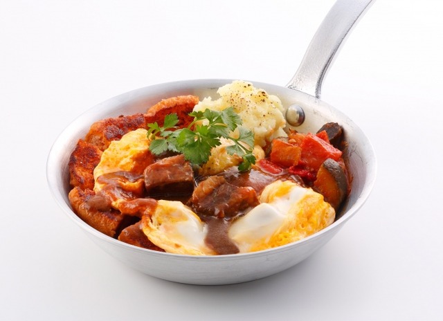 みんな大好きなオムライスをフレンチトーストでアレンジした一品。ふわとろオムレツをまとったミールフレンチトーストにはトマトアパレイユを使用し、仕上げにとろっと濃厚なビーフシチューをかけました。お野菜のうまみたっぷりのラタトゥイユと表面を香ばしく炙ったマッシュポテトもついて、身も心もあったまること間違いなしです!
