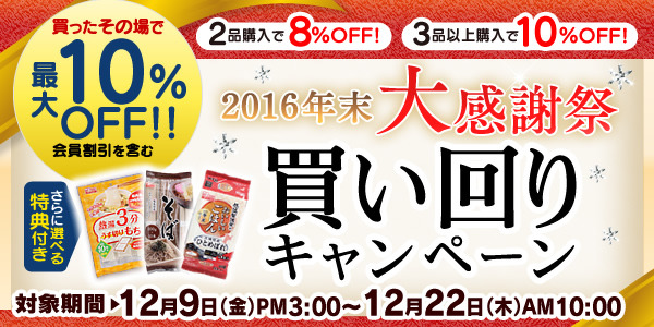 アイリスオーヤマ株式会社(本社:仙台市、代表取締役社長:大山 健太郎)のグループ企業である株式会社アイリスプラザ(宮城県仙台市青葉区中央2丁目1-7 アイリス青葉ビル TEL:0120-323-410)では、1年の感謝の気持ちを込めて2016年末大感謝祭「買い回りキャンペーン」を2016年12月9日(金)3:00PM~2016年12月22日(木)10:00AMまで開催しています。期間中、対象商品を2品購入で8%OFF!3品以上購入で10%OFF!の割引キャンペーンです。さらに、対象商品を3品以上ご購入かつ合計金額が10,000円(税込)以上の場合、年末年始におすすめの厳選3品の中から1品お選びいただいてプレゼントいたします。年末年始のお買い物はぜひアイリスプラザでお楽しみください。